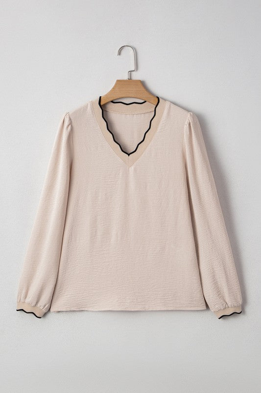 Contrast Trim Scallop V-Neck Long Sleeve Blouse