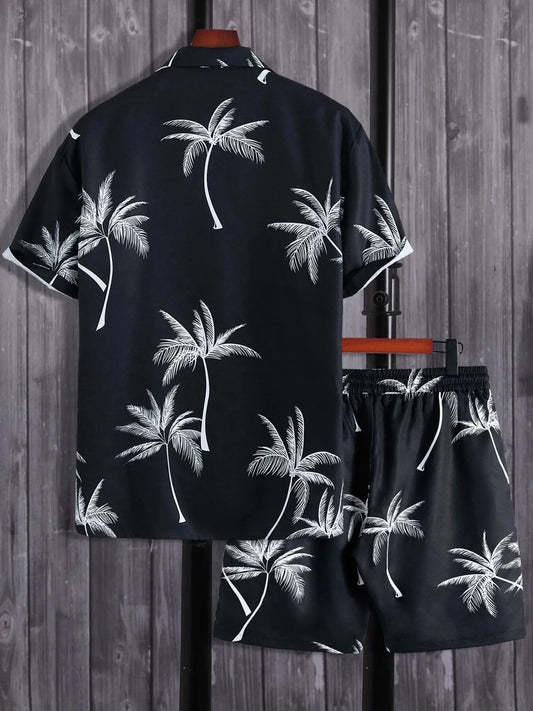 Men's Full Size Palm Print Button Up Shirt and Shorts Set Plus Size