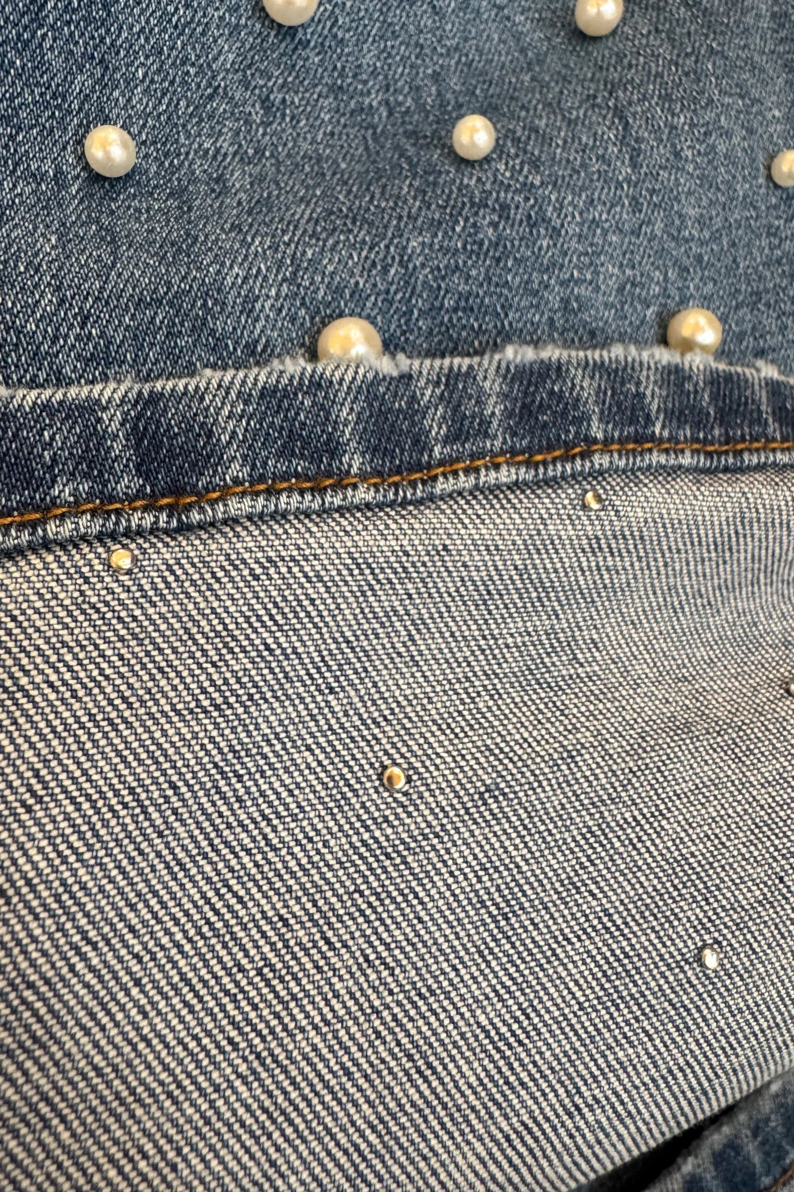 Pearls are riveted into denim for a study hold! Comfortably and not pokey at all!
