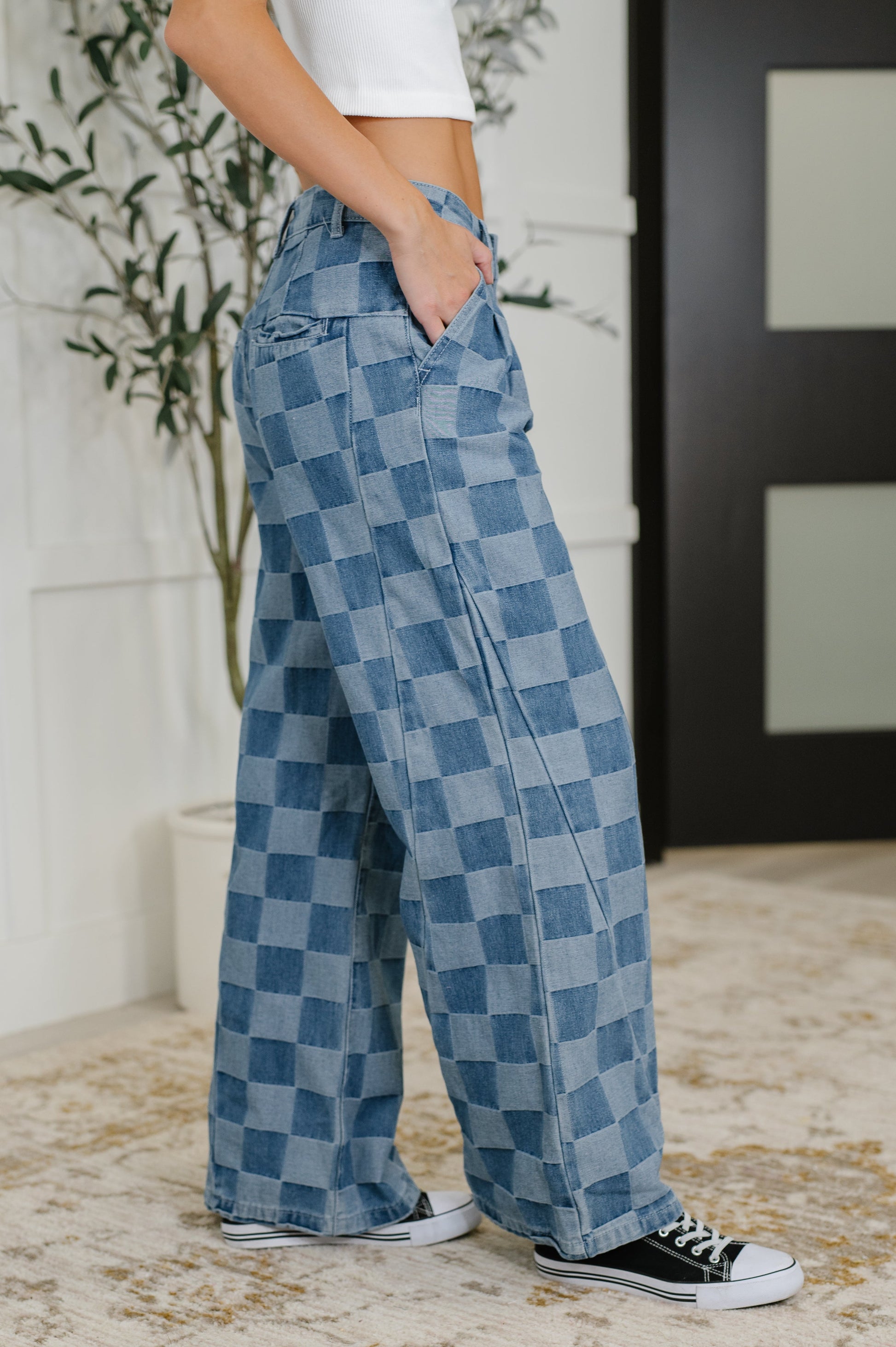 Elevate your wardrobe with these Please Detail Wide Leg Checkered Bottoms crafted from durable denim with no stretch for a structured fit. Featuring a classic zip and button fly, front pleats, and functional pockets—including back welt pockets and belt loops—these checkered pants combine style and practicality. Perfect for making a bold statement while enjoying comfort and versatility. Preorder now to secure this timeless addition to your collection.