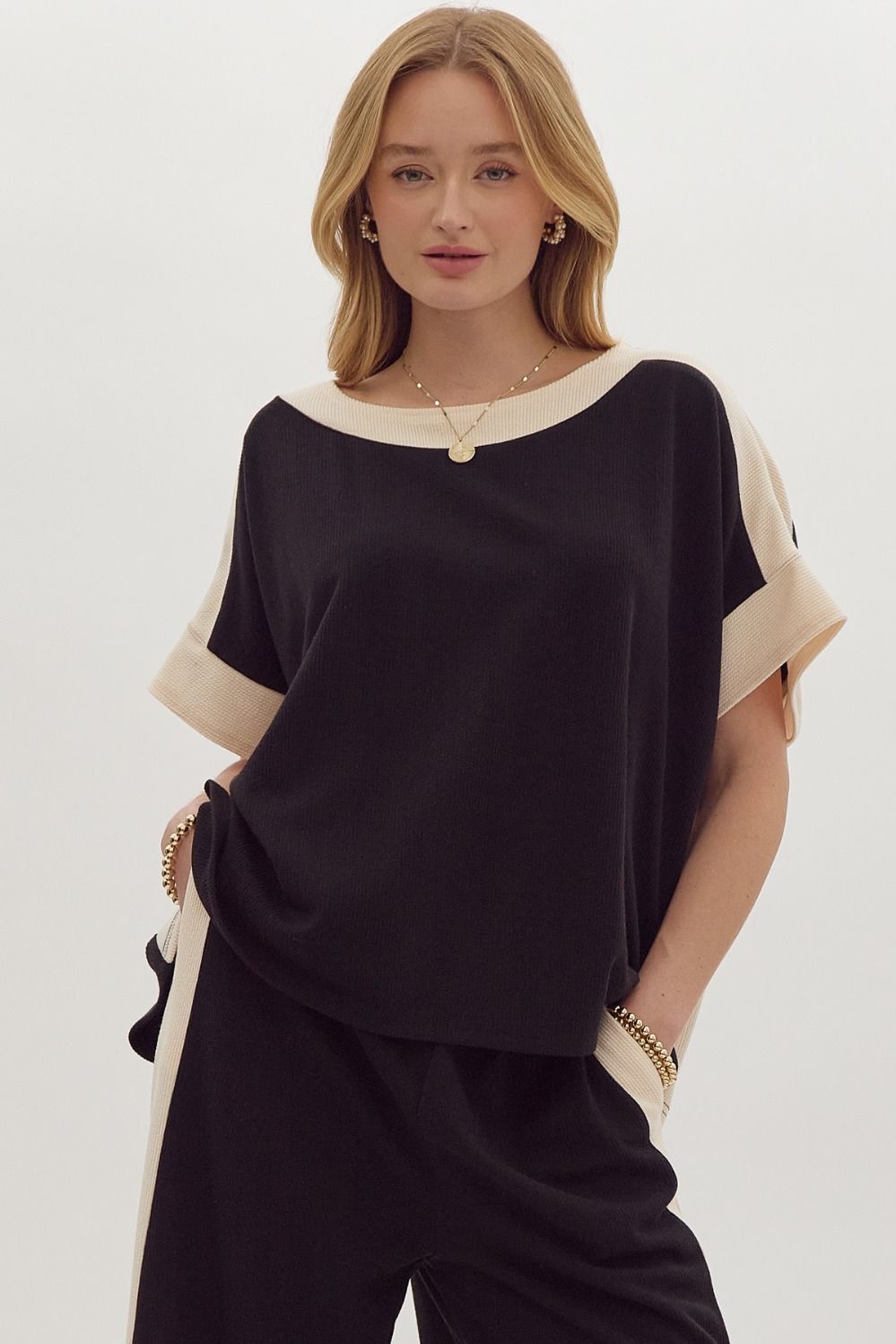 Solid Ribbed Contrast Trim Boatneck Top in Black