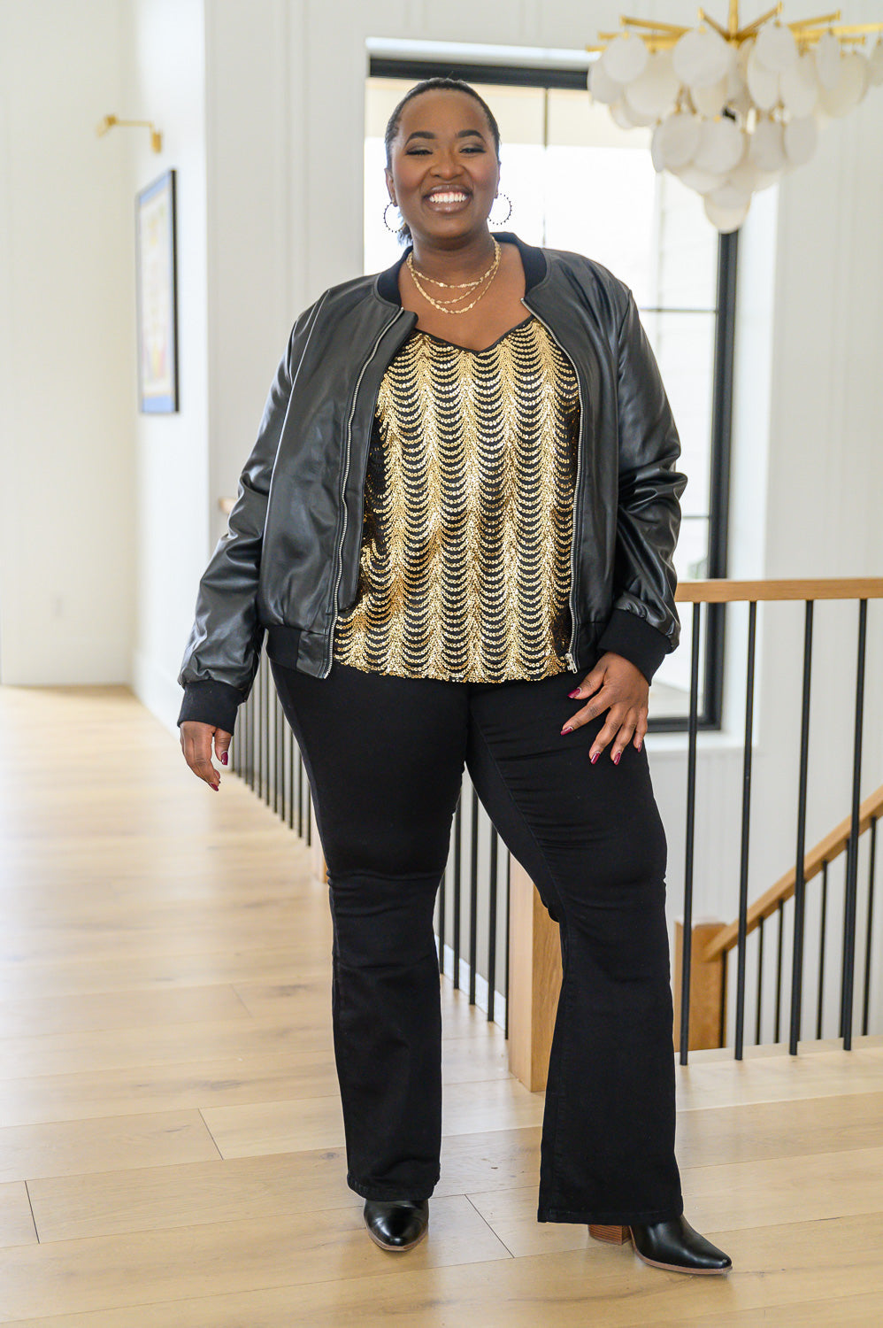 There's no time like the present to rock the Stayin' Alive V-Neck Sequin Tank In Gold! This show stopping piece features a lightweight satin material lined in a scalloped sequin design. Adjustable spaghetti straps support a v-neckline that drops into a loose fit straight-cut bodice. Feel party ready in this stunning sequin tank!