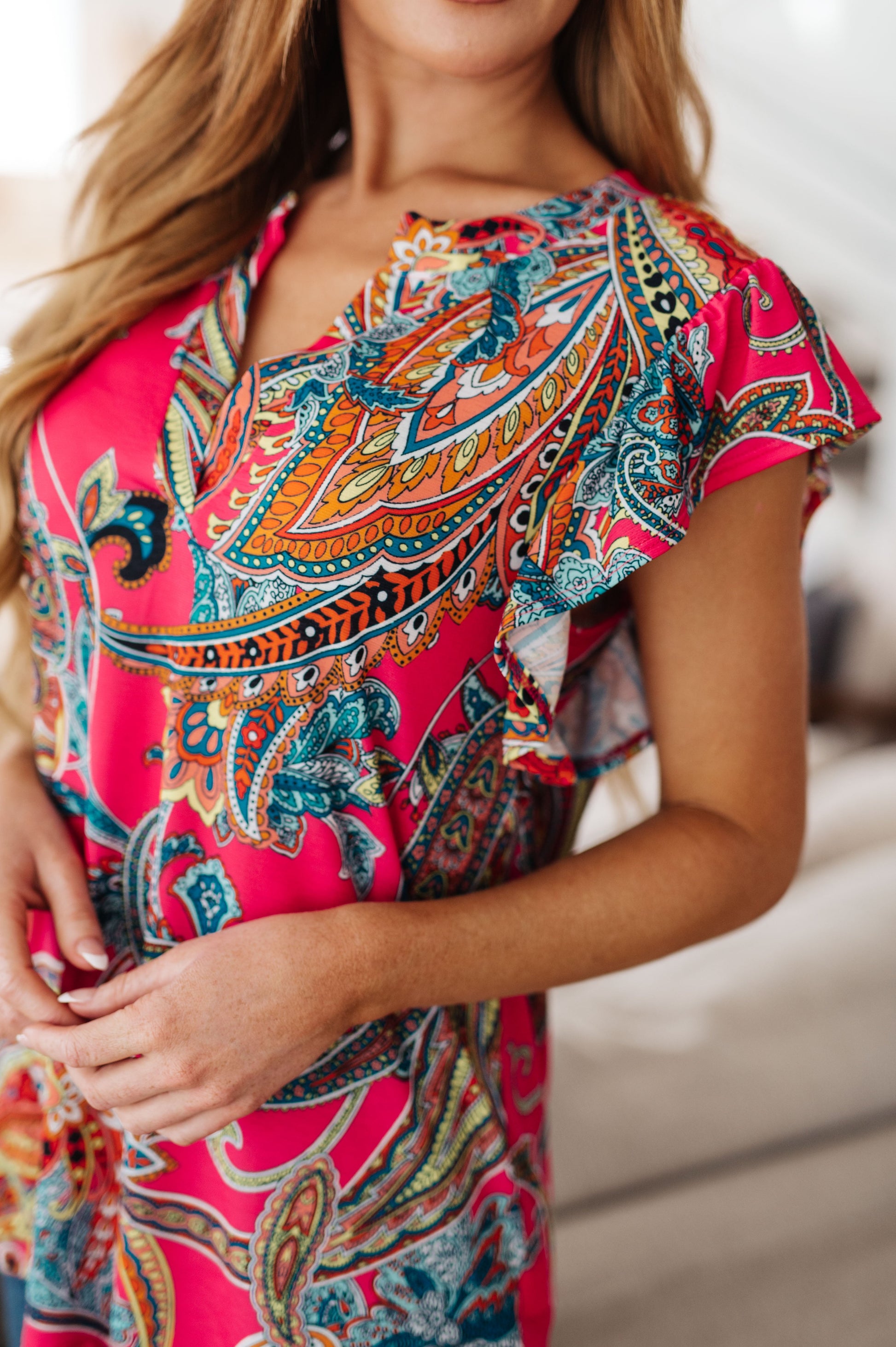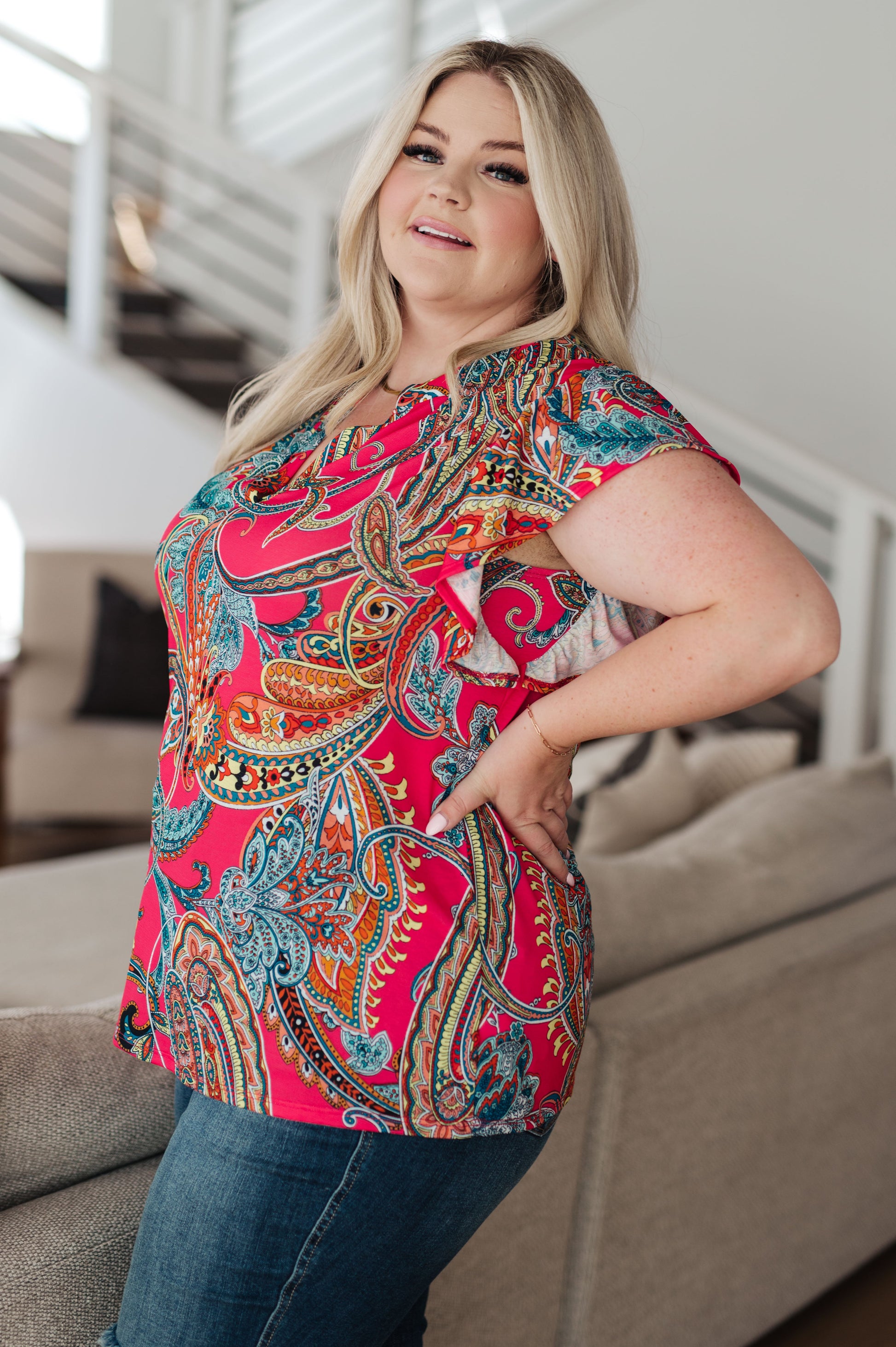 This stunning Still Overthinking It Paisley Top is the perfect addition to your everyday wardrobe. Made from easy wear bulgari fabric, it features a v-neckline, flutter sleeve, and a beautiful bright paisley print. Upgrade your looks and make a statement with this eye-catching and versatile top!